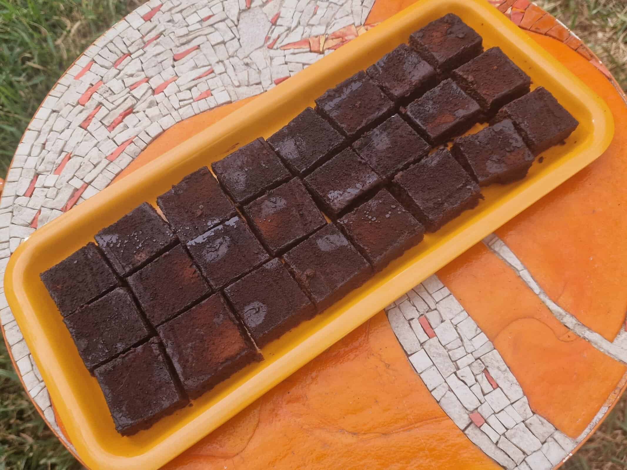 !!! Pour les pots du Festival, je double les quantités, et cuis le gâteau dans un grand plat rectangulaire. Je le mets au frigo ou au congélateur si préparé quelques jours à l’avance, et le découpe en cubes (environ 60 cubes)